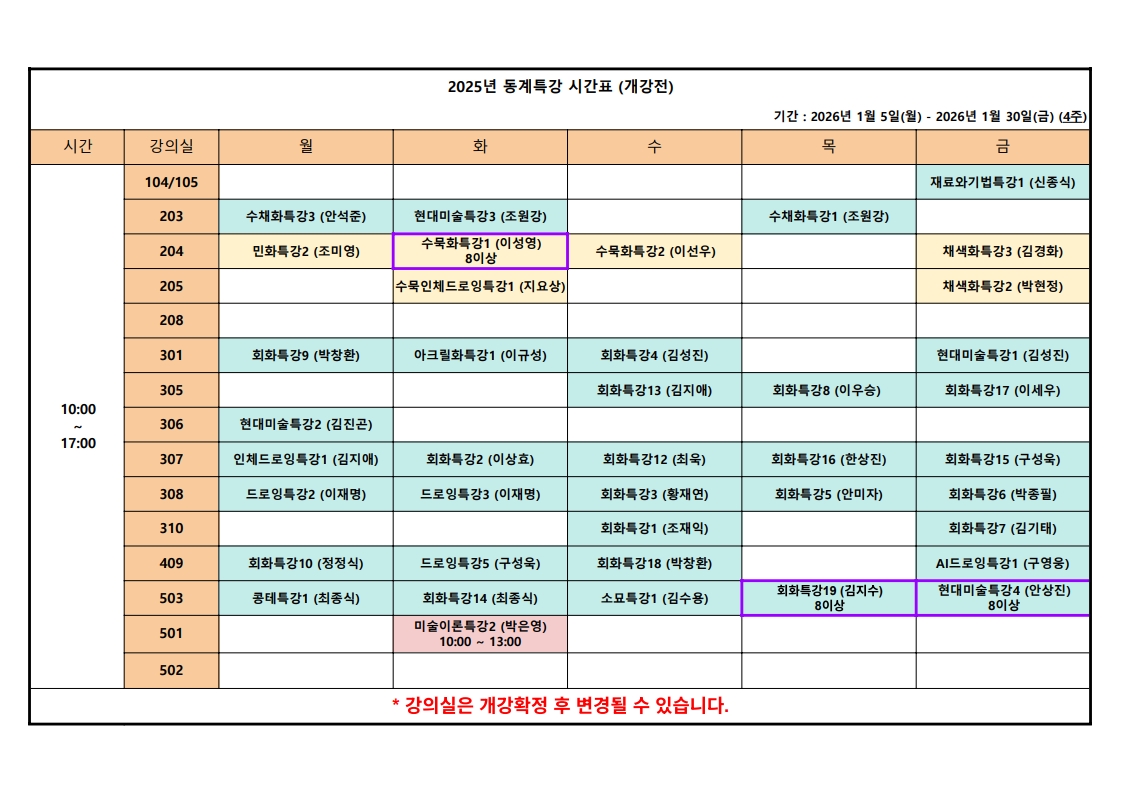 1. 특강 기간 미술실기 및 이론 (4주) : 2026. 1. 5.(월) ~ 2026. 1. 30.(금)