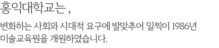 1991년에는 미술디자인교육원으로 그 교육내용과 규모를 확장하여 본교의 특화된 역량에 걸 맞는 열린 예술 교육의 선구적 역할을 담당해 왔습니다. 이로써 배움의 열정을 간직한 많은 사람들이 예술과 함께 삶의 질을 향상시키며 자아실현과 사회발전에 기여할 수 있었습니다. 이는 홍익대학의 교육 정신인 ‘홍익인간’의 이념을 따르는 노력이기도 합니다.