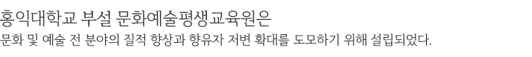 문화예술평생교육원은 홍익대학교의 특성을 살려 1986년에 개원한 미술교육원을 전신으로, 설립 이래 현재까지 37,599 명의 수료생을 배출하며 정규 교육과정에서 제외되었던 개인과 지역사회의 다양한 문화예술 교육에 기여해 왔다.